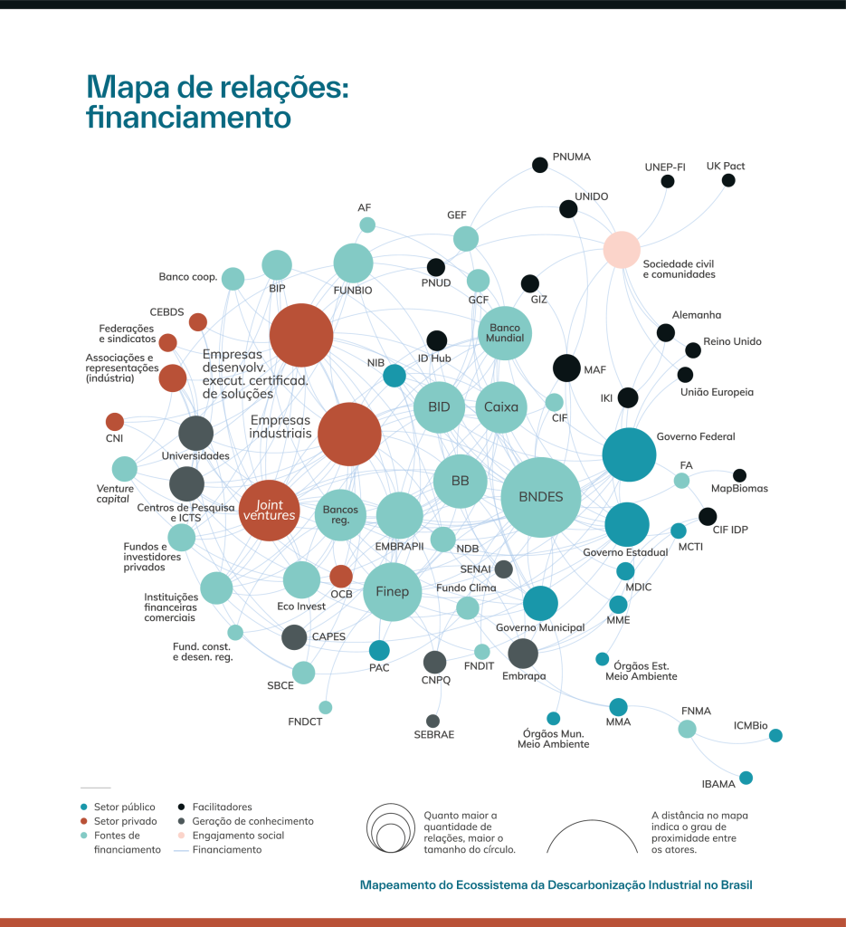 Da mesma forma, foram mapeados 104 atores em seis áreas: setores privado e público, fontes de financiamento, facilitadores, geração de conhecimento e engajamento social, e quatro tipos de relações: financiamento, coordenação, facilitação e representação. O olhar para esse ecossistema permitiu identificar onde há articulações e iniciativas que estão funcionando bem e onde há lacunas e oportunidades.